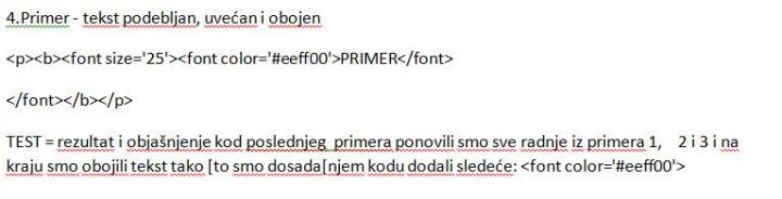 TEST= rezultat i objašnjenje kod poslednjeg primera ponovili smo sve radnje iz primera 1, 2 i 3 i na kraju smo obojili tekst tako [to smo dosada[njem kodu dodali sledeće: