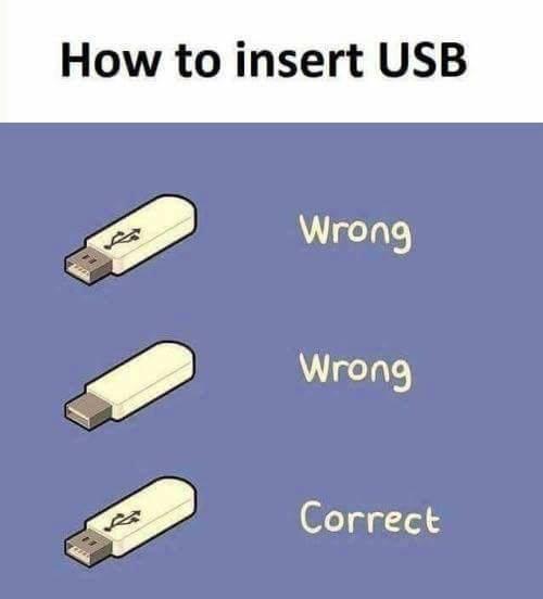 Kad uzmete USB u ruke možete da odredite gornju i donju stranu instant tako što ćete videti USB simbol, osetiti simbol ili videti rupice. Dakle, veoma je lako, imate tri indikatora čak. Svaki čovek sa minimalnom inteligencijom može da odredi gornju i donju stranu u deliću sekunde.